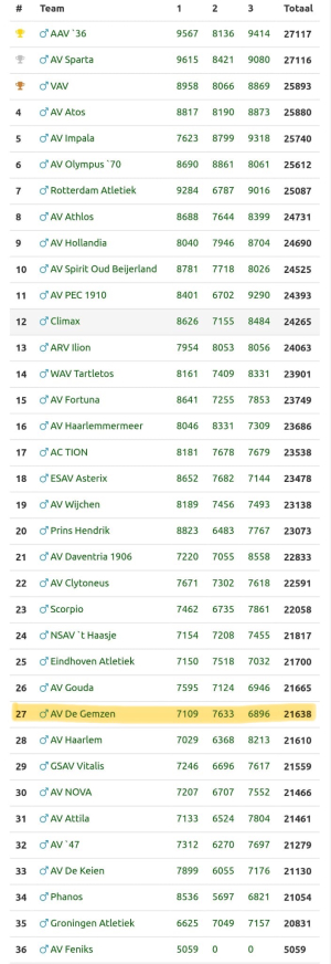 En dan nu misschien wel het belangrijkste, waar het eigenlijk allemaal om draait in de competitie: het eindklassement! We doen natuurlijk niet alleen mee voor de lol (alhoewel het altijd hartstikke leuk is). Het was de hele dag spannend en dat bleek ook uit de eindstand. In het landelijke eindklassement hadden we 21.638 punten, wat goed was voor plaats 27 van de 36. Dit betekent dat we ook volgend jaar weer mogen uitkomen in de 2edivisie! Een fantastisch resultaat waar we allemaal hard voor hebben gewerkt en het uiteindelijk toch voor elkaar hebben gekregen. Het verschil met plek 30 was slechts 172 punten. Kenners in de competitie weten dat dit maar weinig punten zijn; een paar seconden sneller of een kogel of discus iets verder werpen en je hebt dat aantal punten.